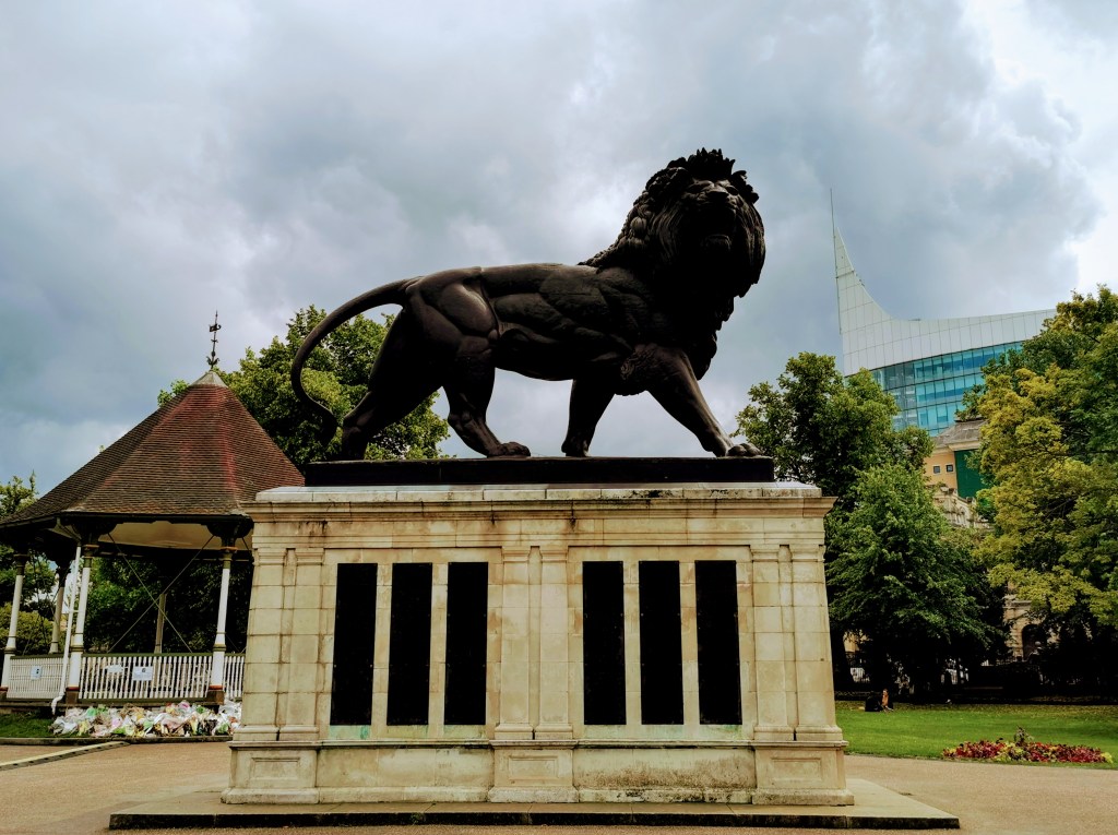 The Maiwand Lion stands in the centre of the Gardens, and has become an unofficial symbol of Reading. It was erected in 1886 as a memorial to local soldiers killed in Afghanistan. In the photo below you can see floral tributes to those killed in the recent terrorist incident, placed around the bandstand.