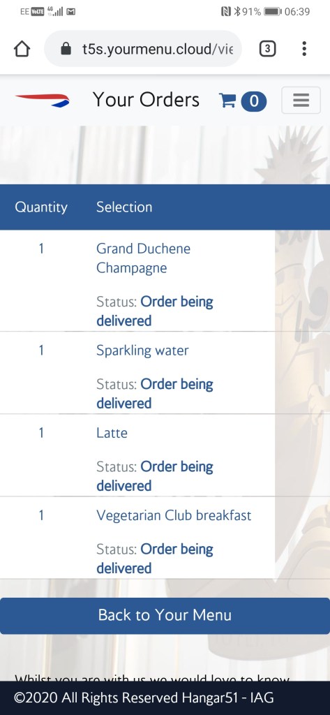 In the lounge there are plenty of free tables and loads of staff. Before coronavirus, it was tricky to find anyone to assist, but today they’re ready and waiting to serve you. I like it. You scan a QR code on your table to order food and drinks via an app, which takes us a minute to figure out (instructions might be helpful) but once we’ve ordered it works like a dream.