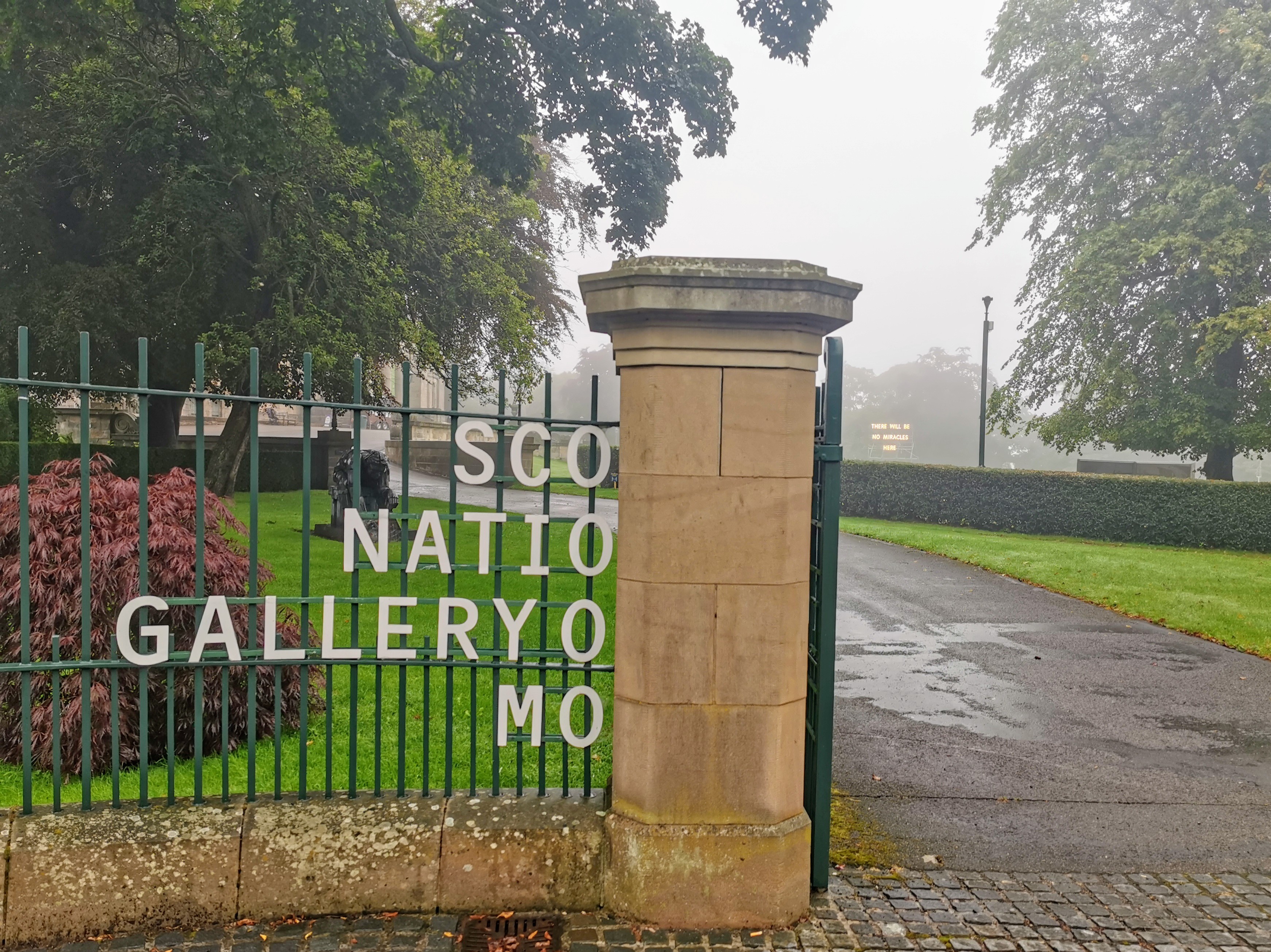 Emerging from our eerie riverside walk at the Scottish National Gallery of Modern Art, we stop to ponder Nathan Coley’s outdoor sculpture There Will Be No Miracles Here. It seems a strange sentiment outside a temple to the arts – surely here is exactly where you would expect inspiration to strike?