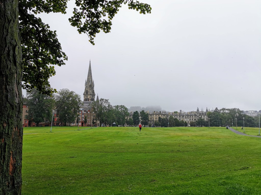 The views across Bruntsfield Links and The Meadows towards the Old Town are less impressive and less recognisable than usual, for us at least. We’ve been lucky enough to get great weather on our previous trips. Today, the Castle has simply disappeared into the murk. But the luminous colour of the parkland bears witness to the nature of the climate here. At home in Berkshire, the grass is like straw. Never mind, there are plenty of nice cosy bars in town if it starts to rain again.
